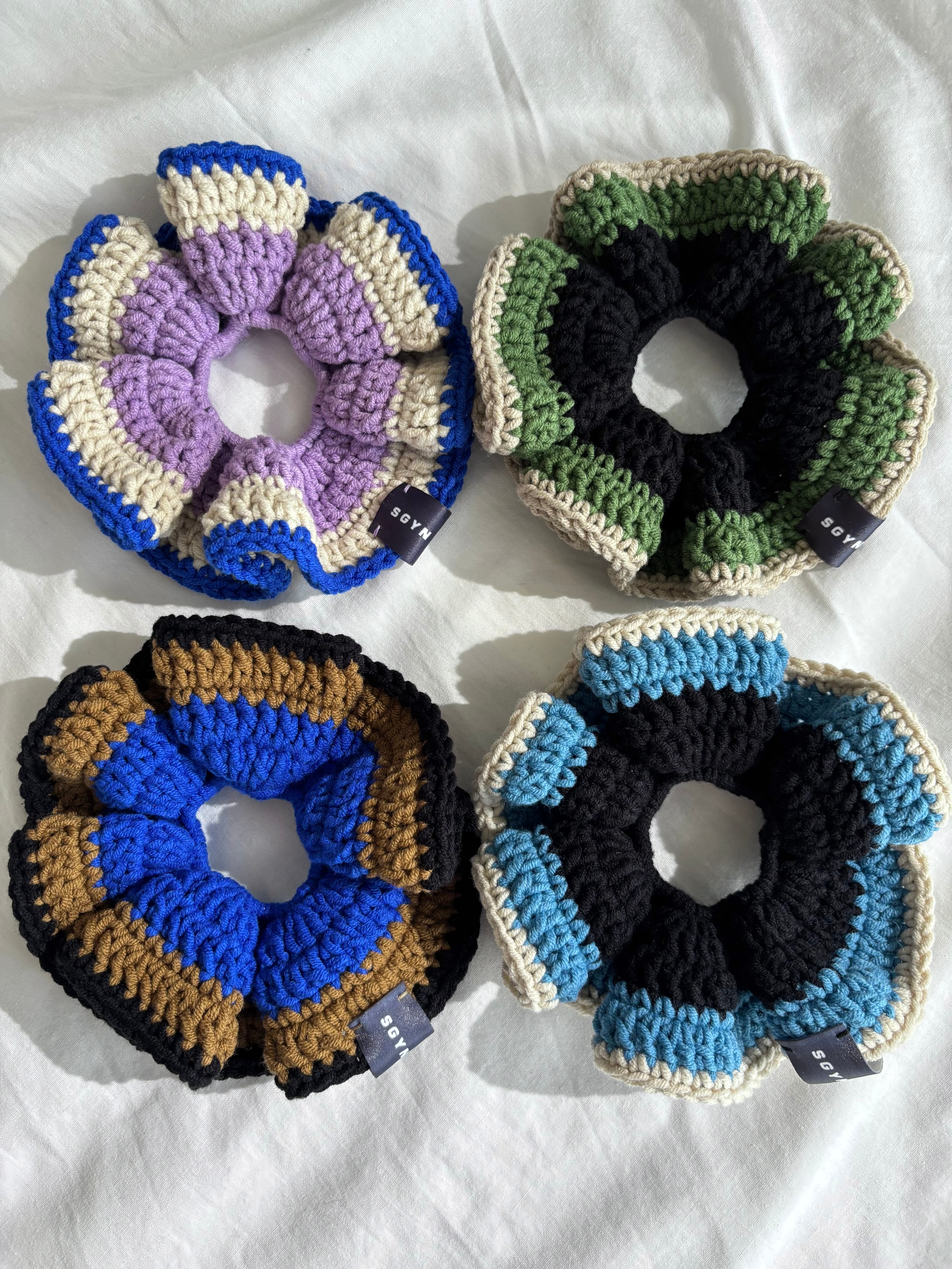 オールシーズン使用できるコットン混素材のクロシェ編みのシュシュ。