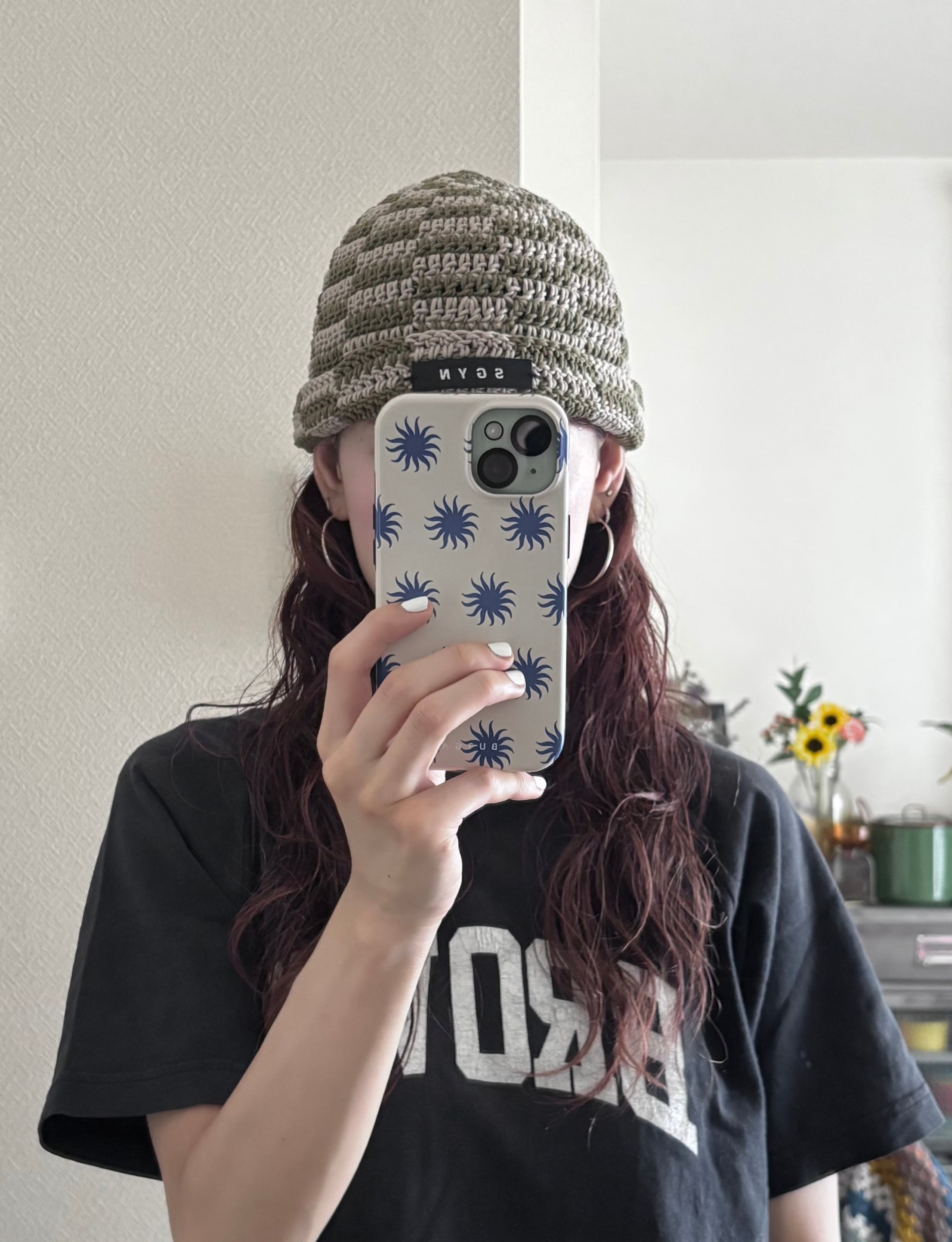 太めのコットン糸でざっくりと編み立てたクロシェ編みのニットキャップ。