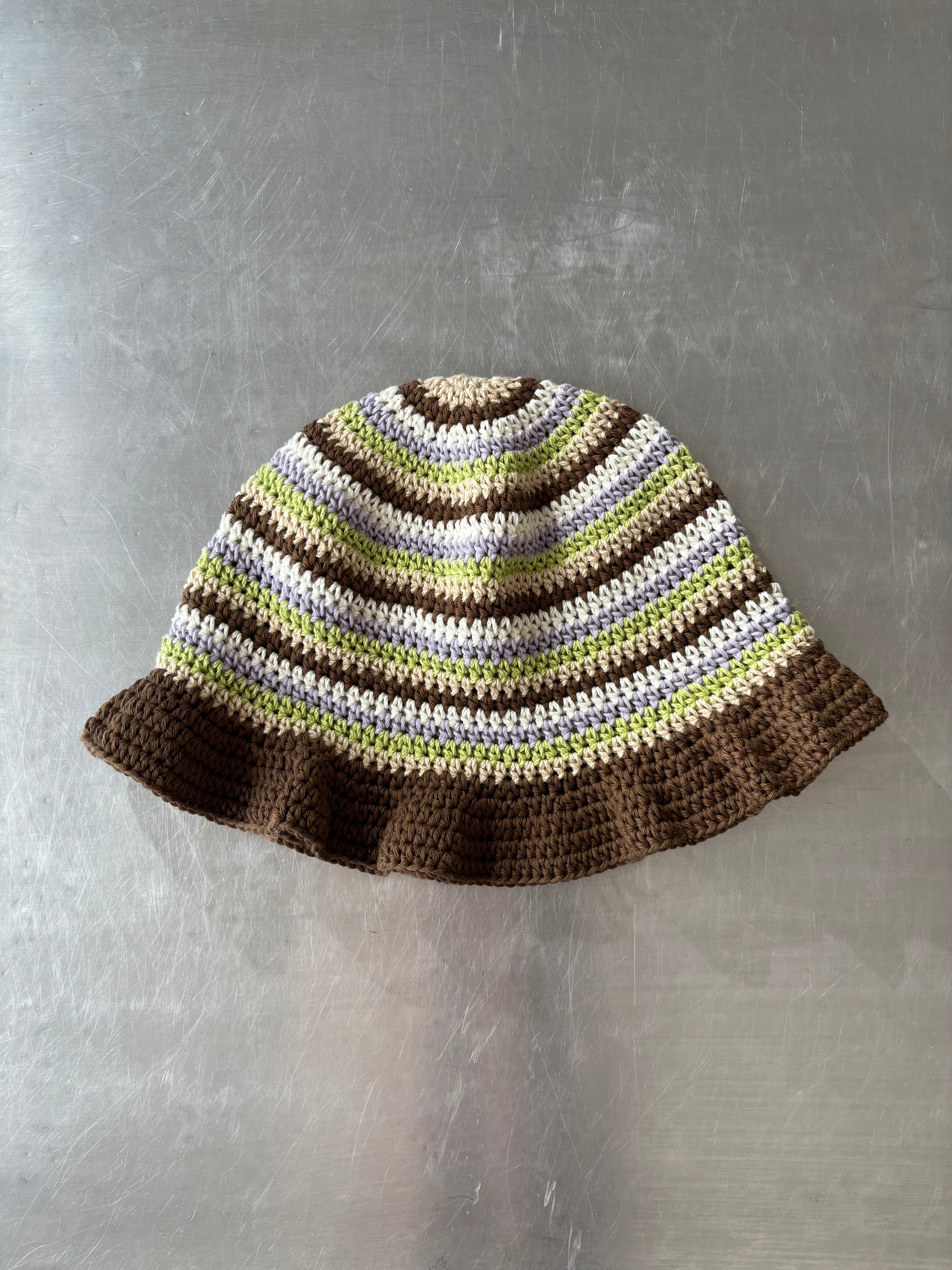 配色にこだわったマルチボーダー柄とフリルになったブリムが特徴。やわらかく軽いかぶり心地です。