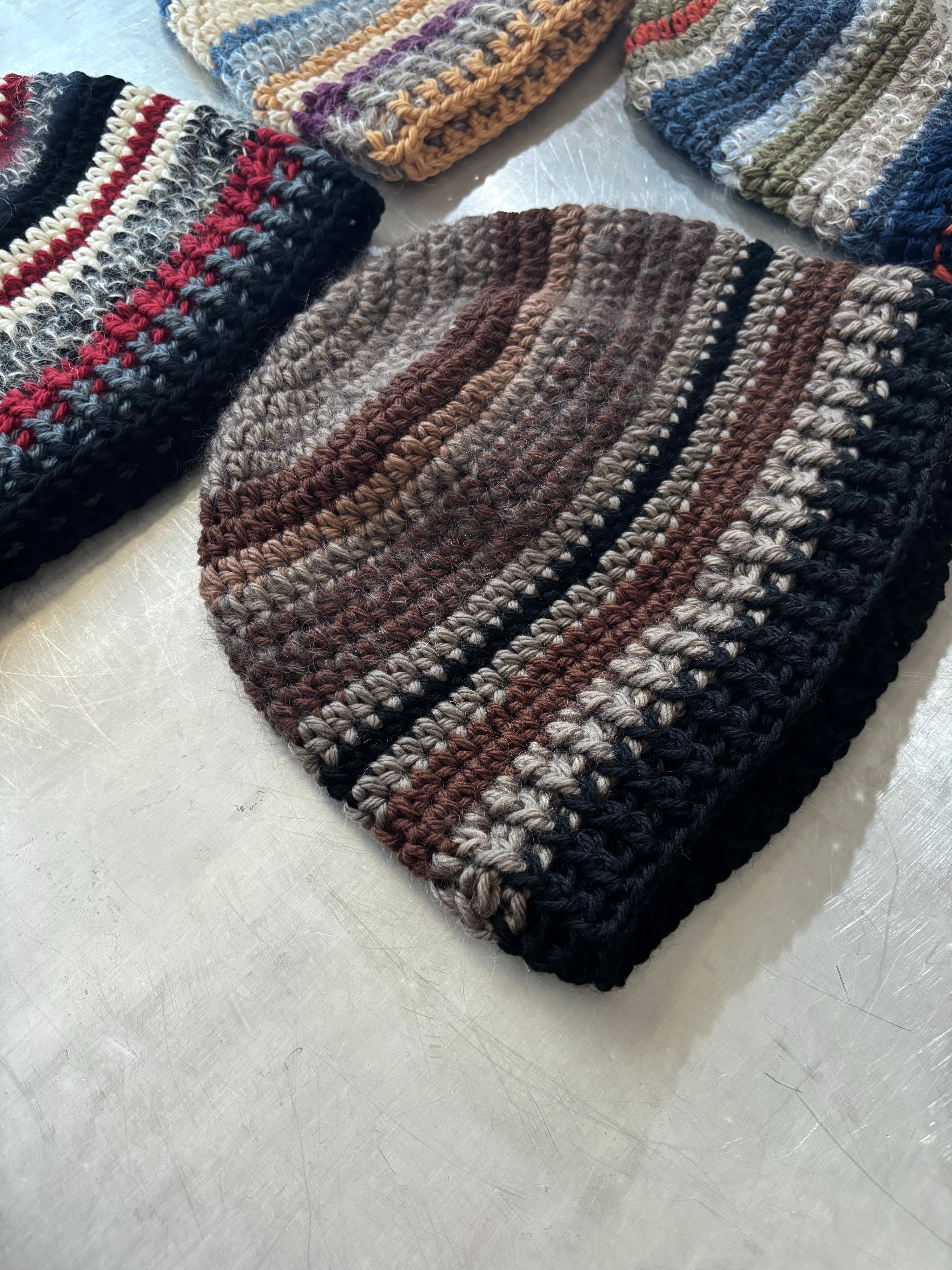 ユニセックスデザインのクロシェ編みのビーニー。メリノウールをベースにモヘアとシルクのブレンド糸を使用した贅沢な素材で編み立てました。