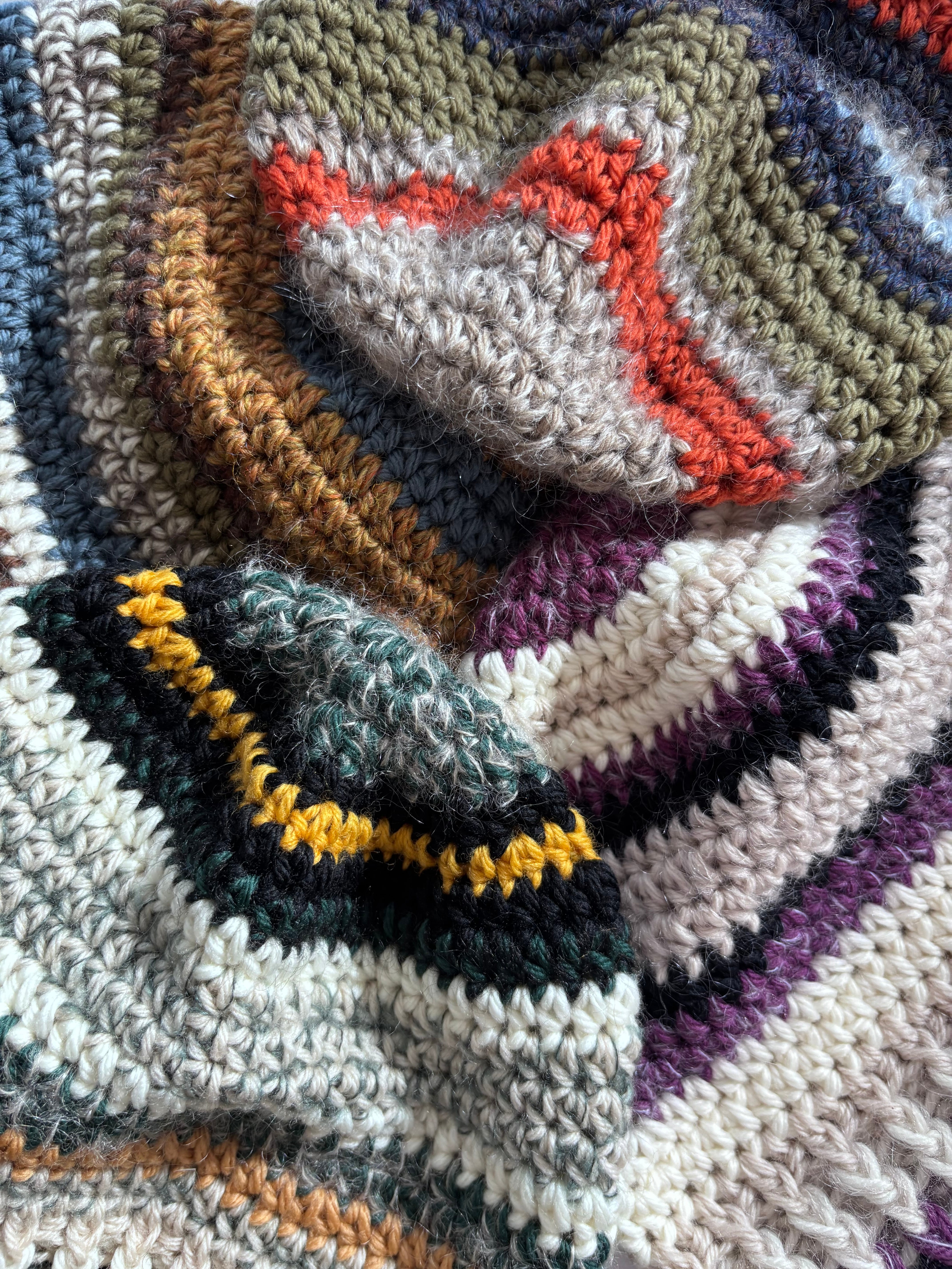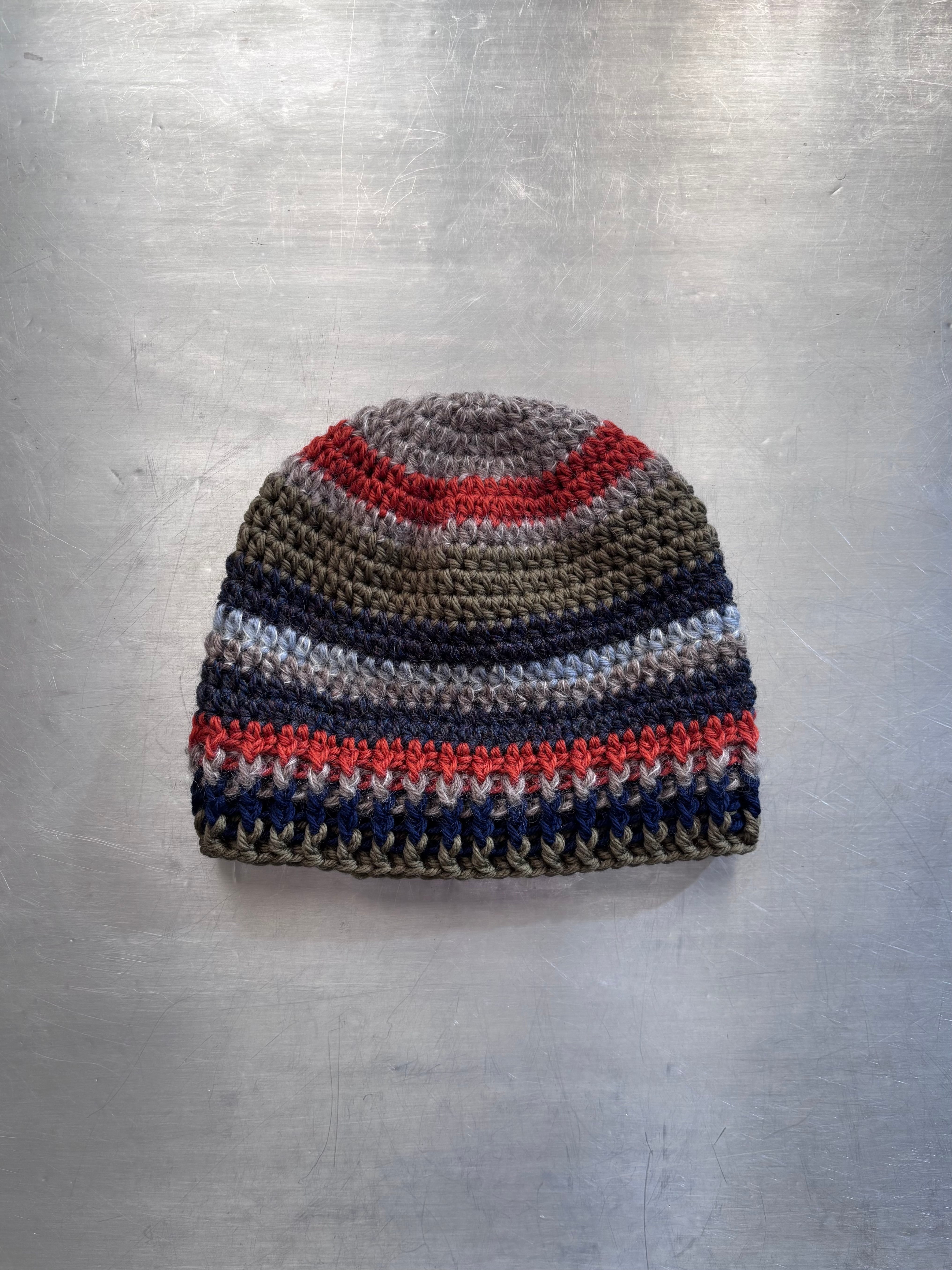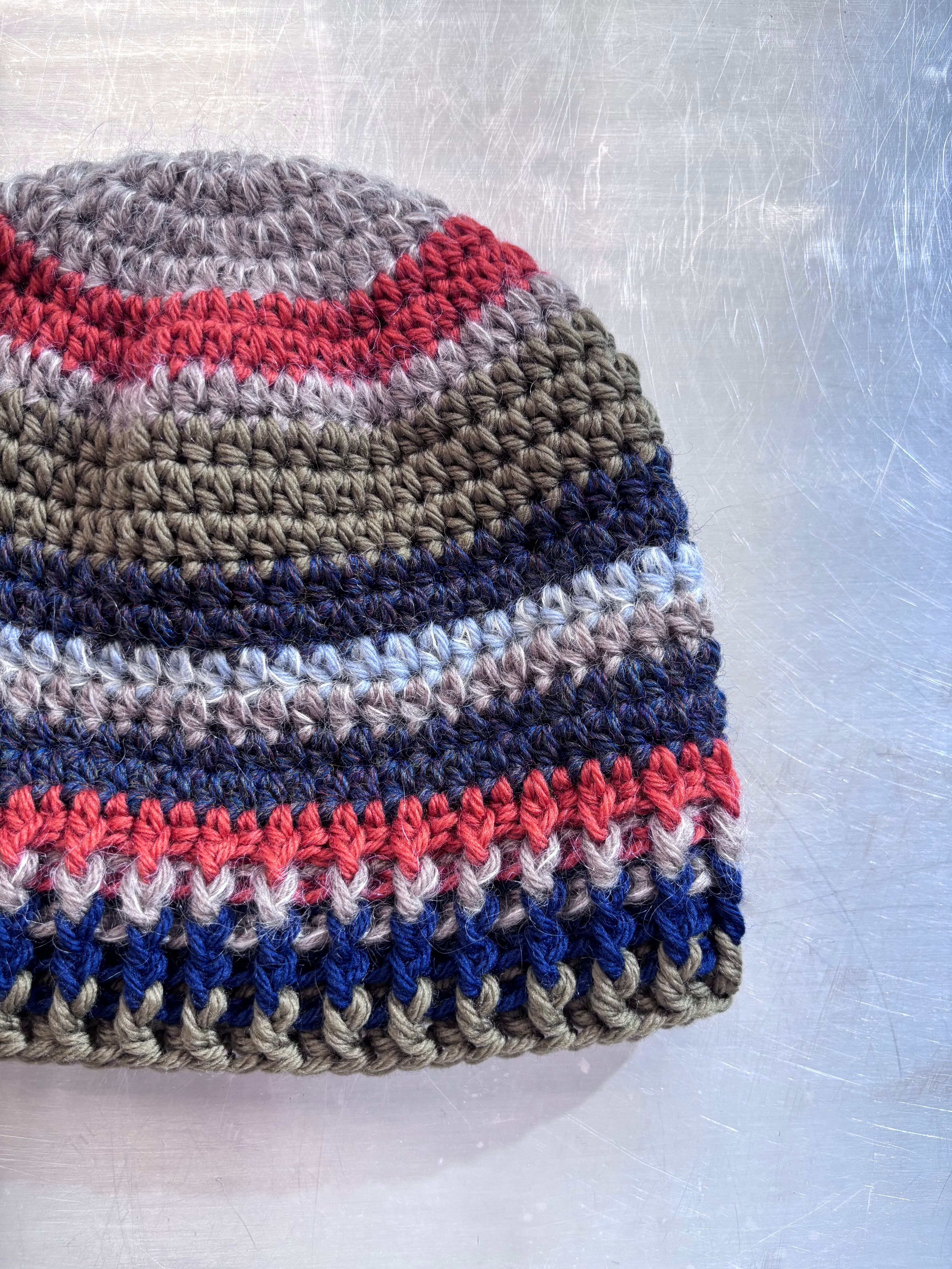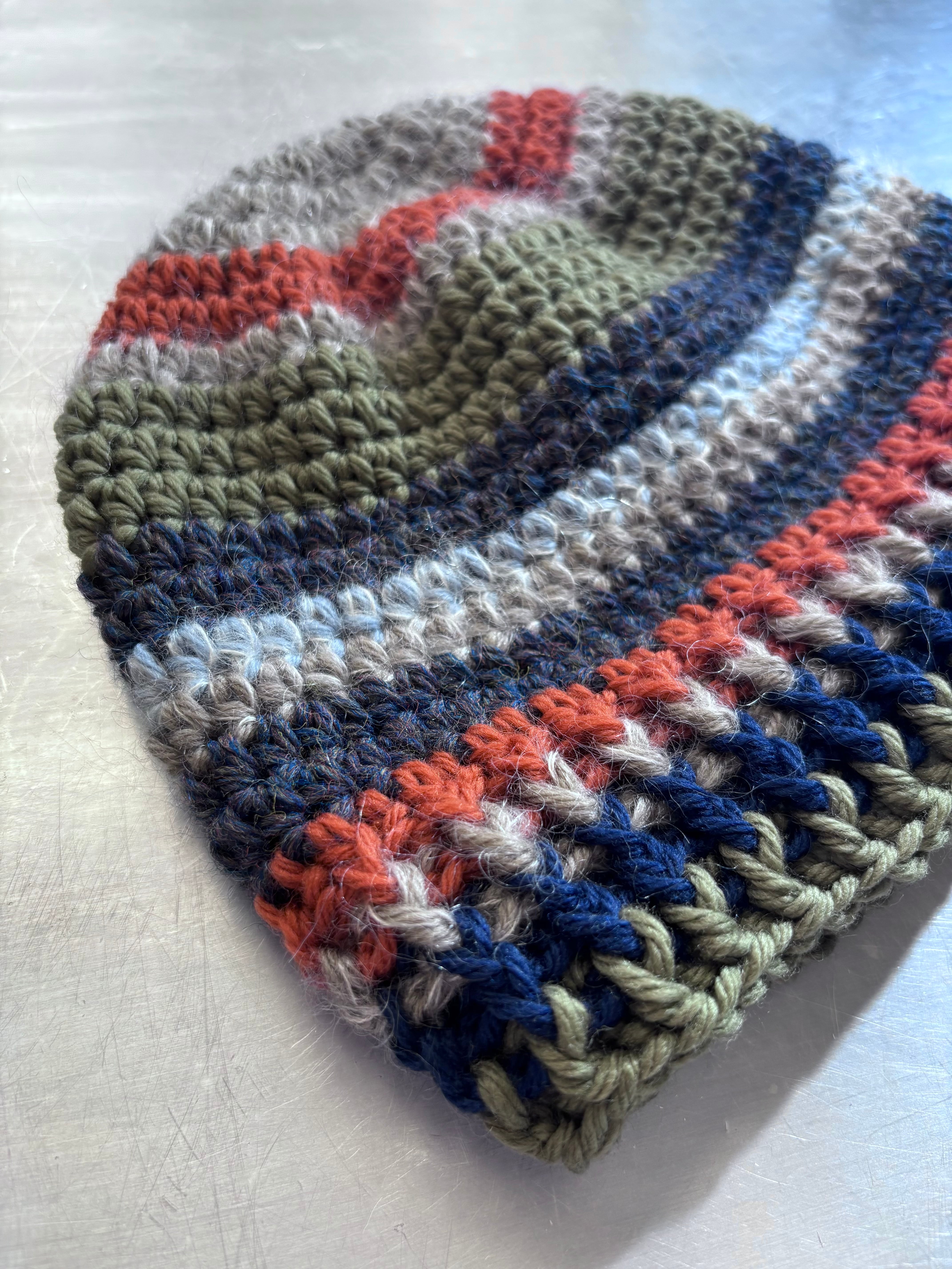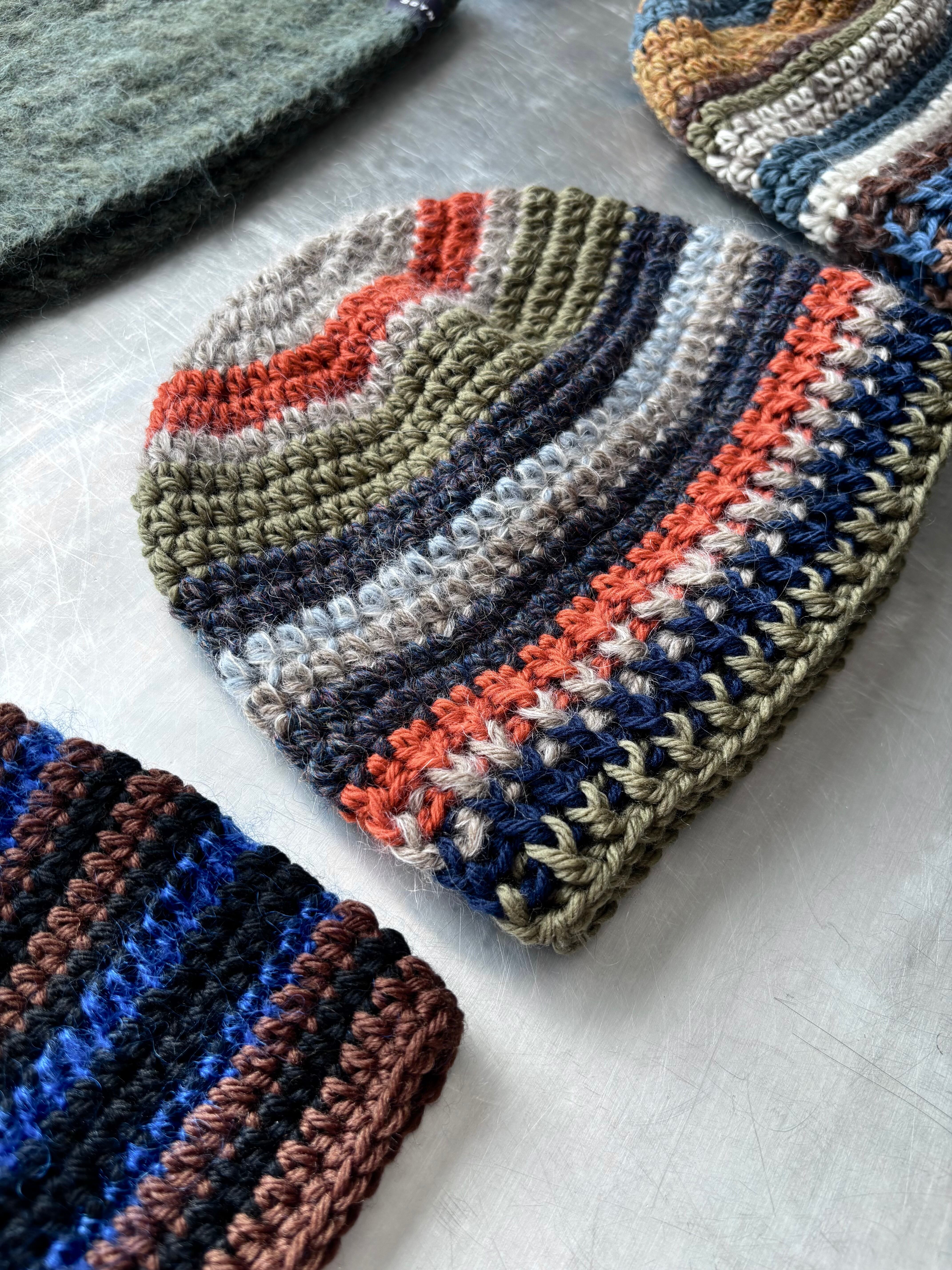 ユニセックスデザインのクロシェ編みのビーニー。メリノウールをベースにモヘアとシルクのブレンド糸を使用した贅沢な素材で編み立てました。