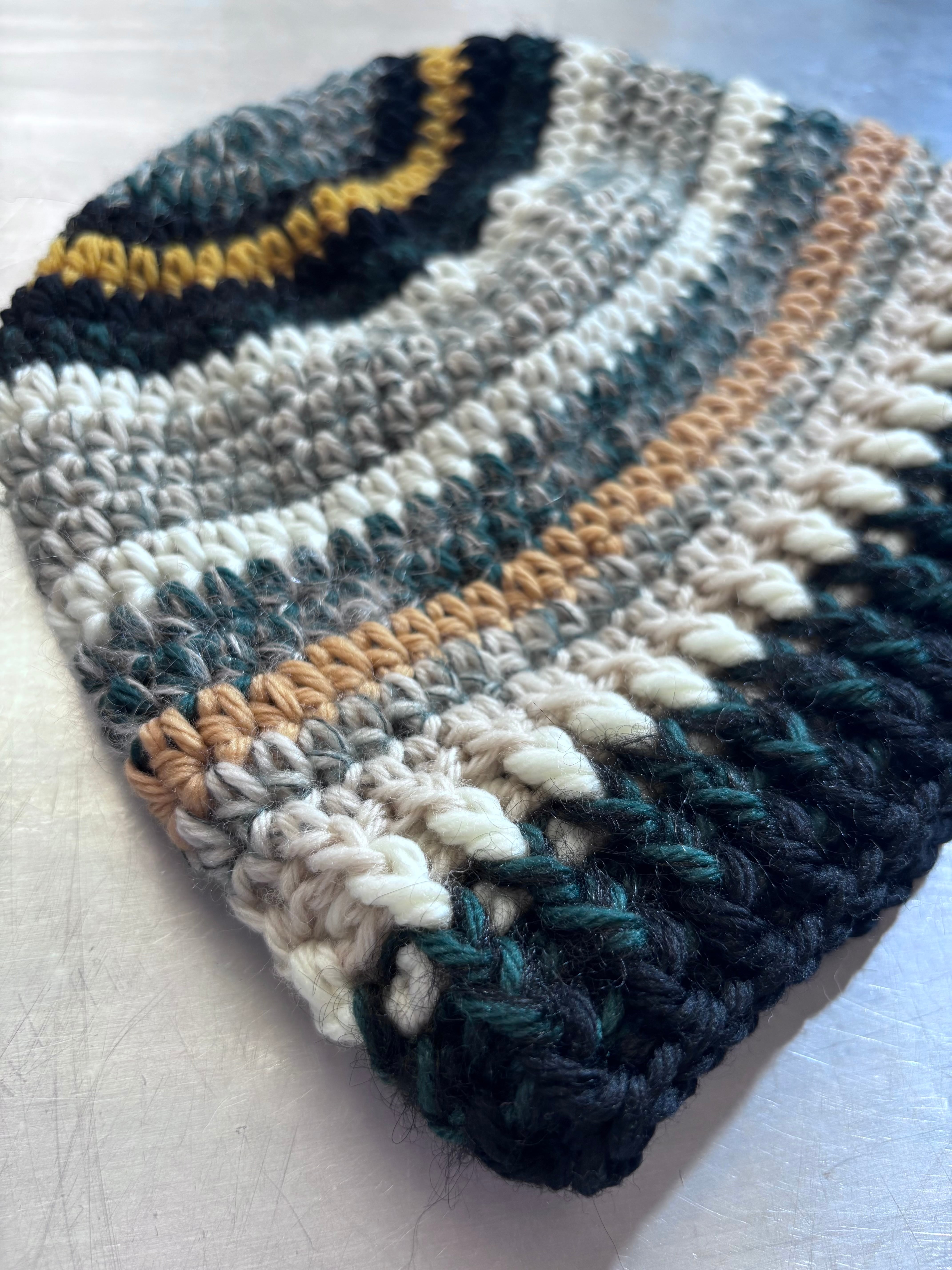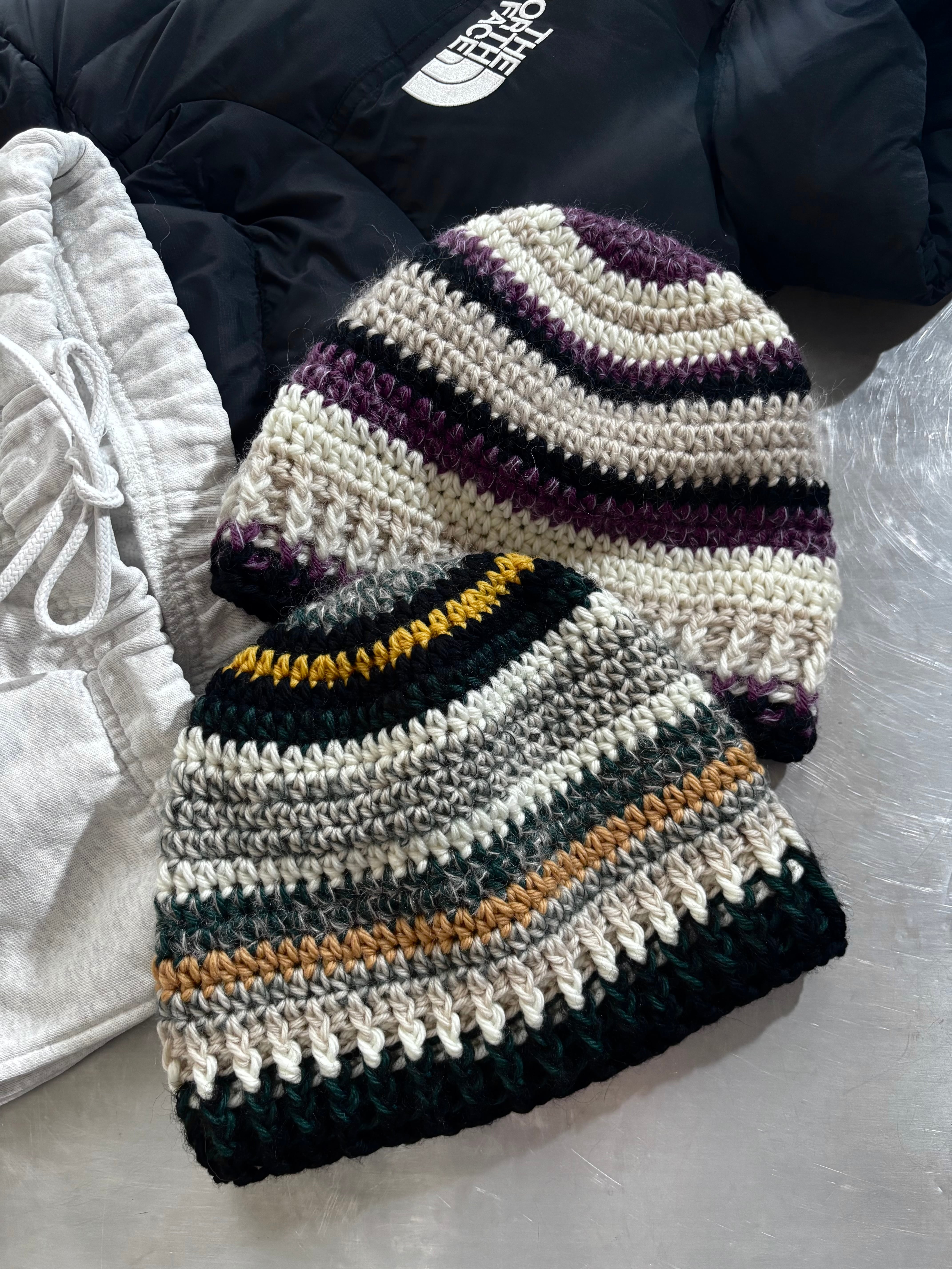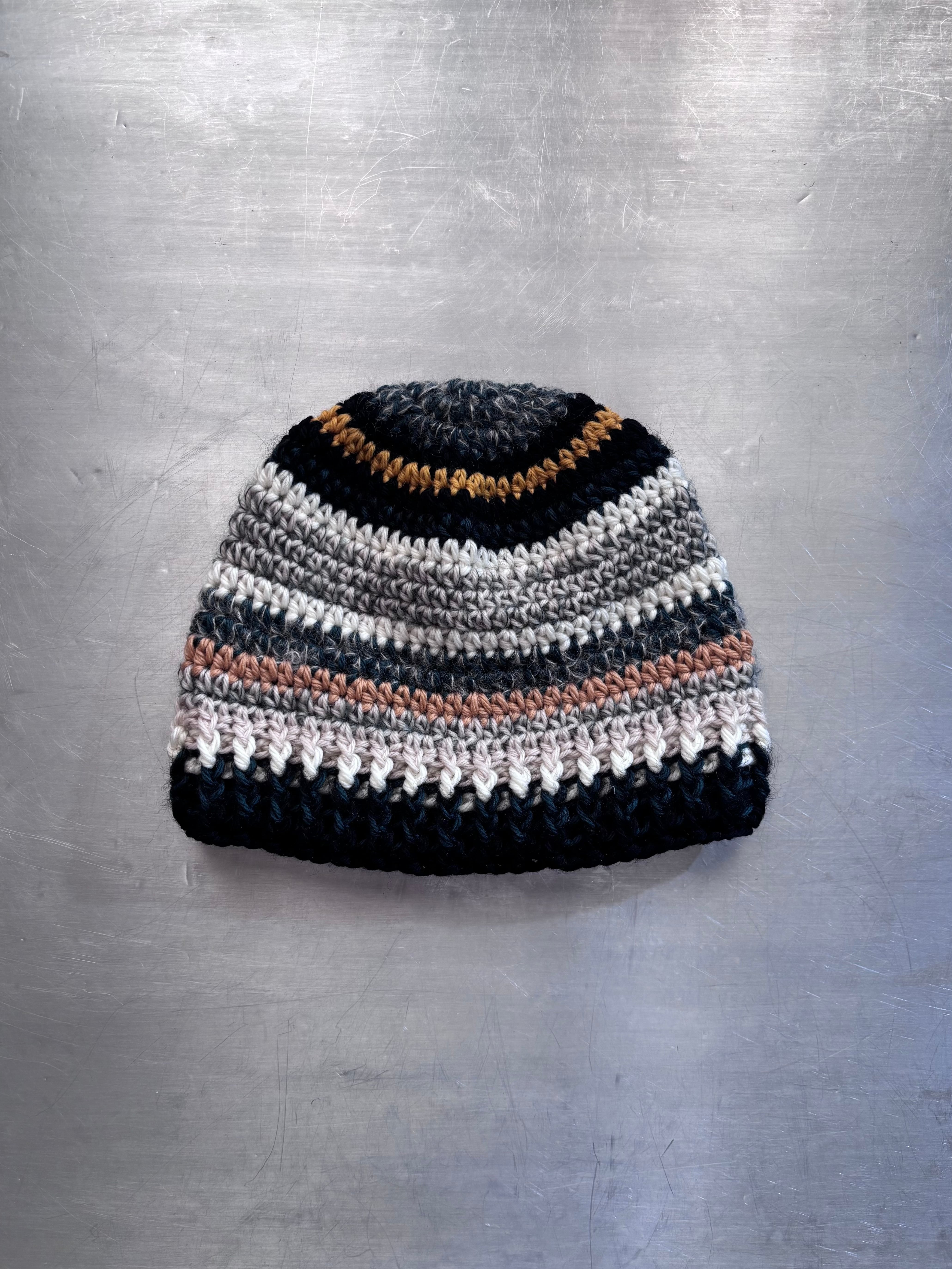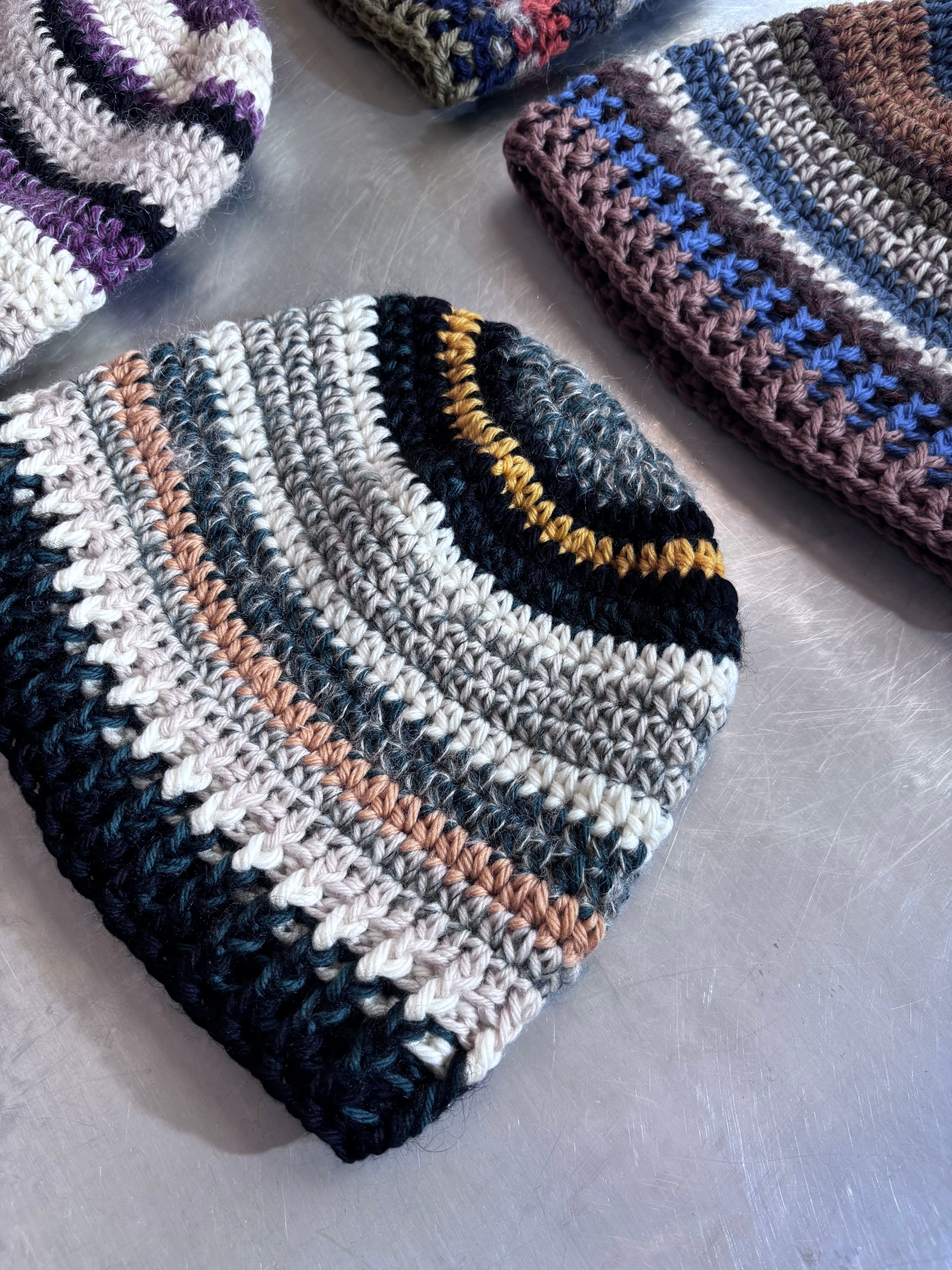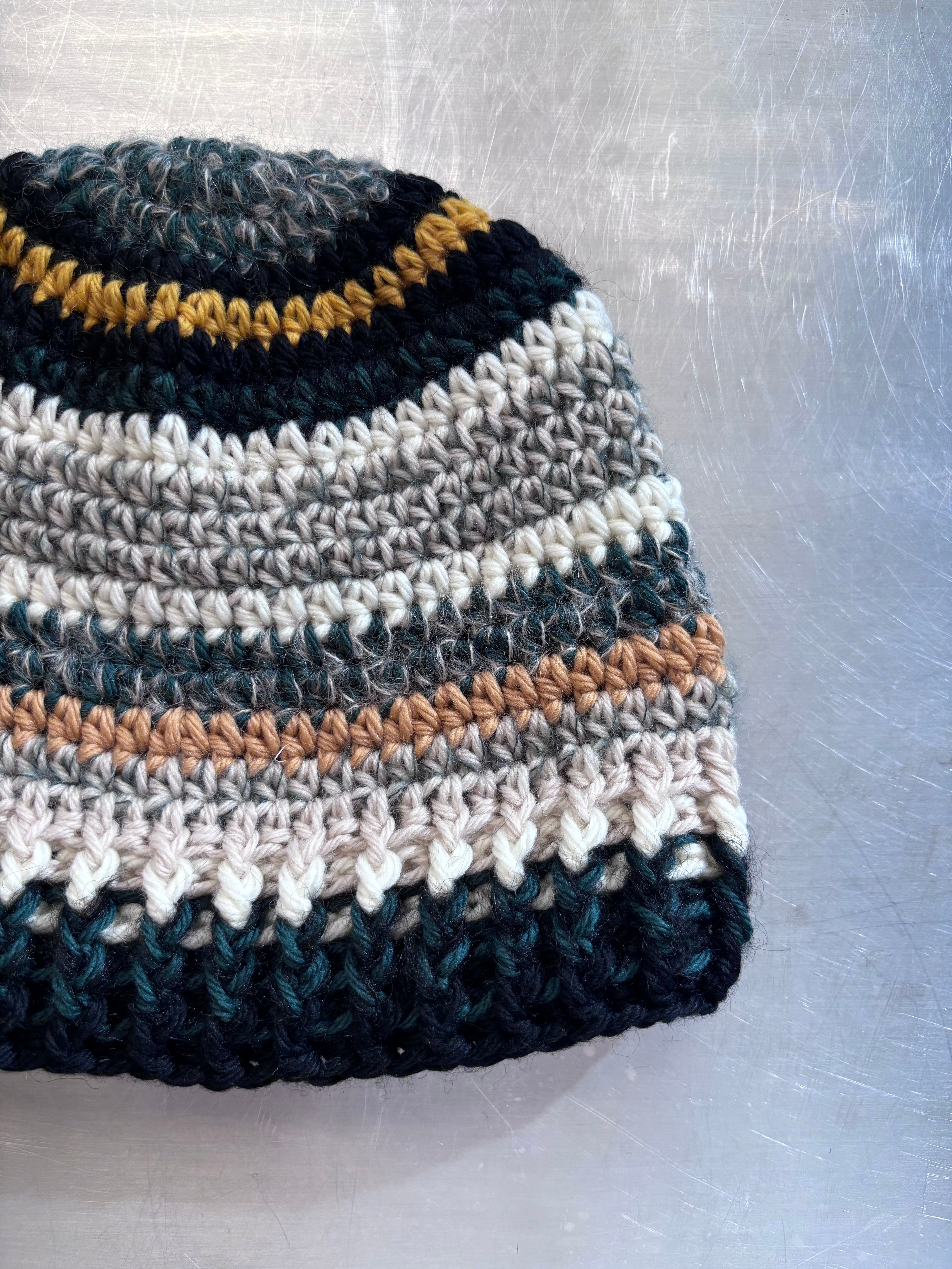 ユニセックスデザインのクロシェ編みのビーニー。メリノウールをベースにモヘアとシルクのブレンド糸を使用した贅沢な素材で編み立てました。