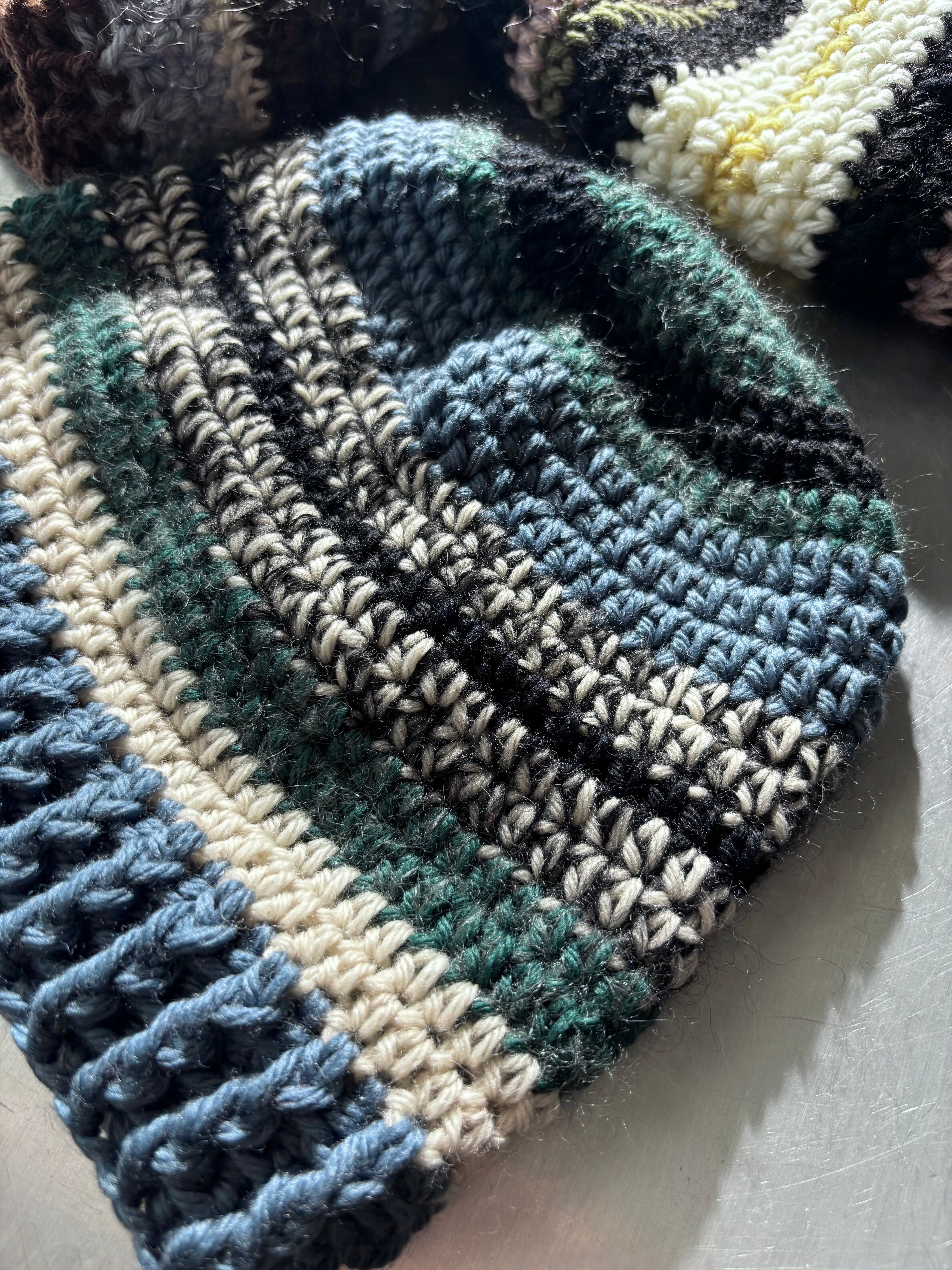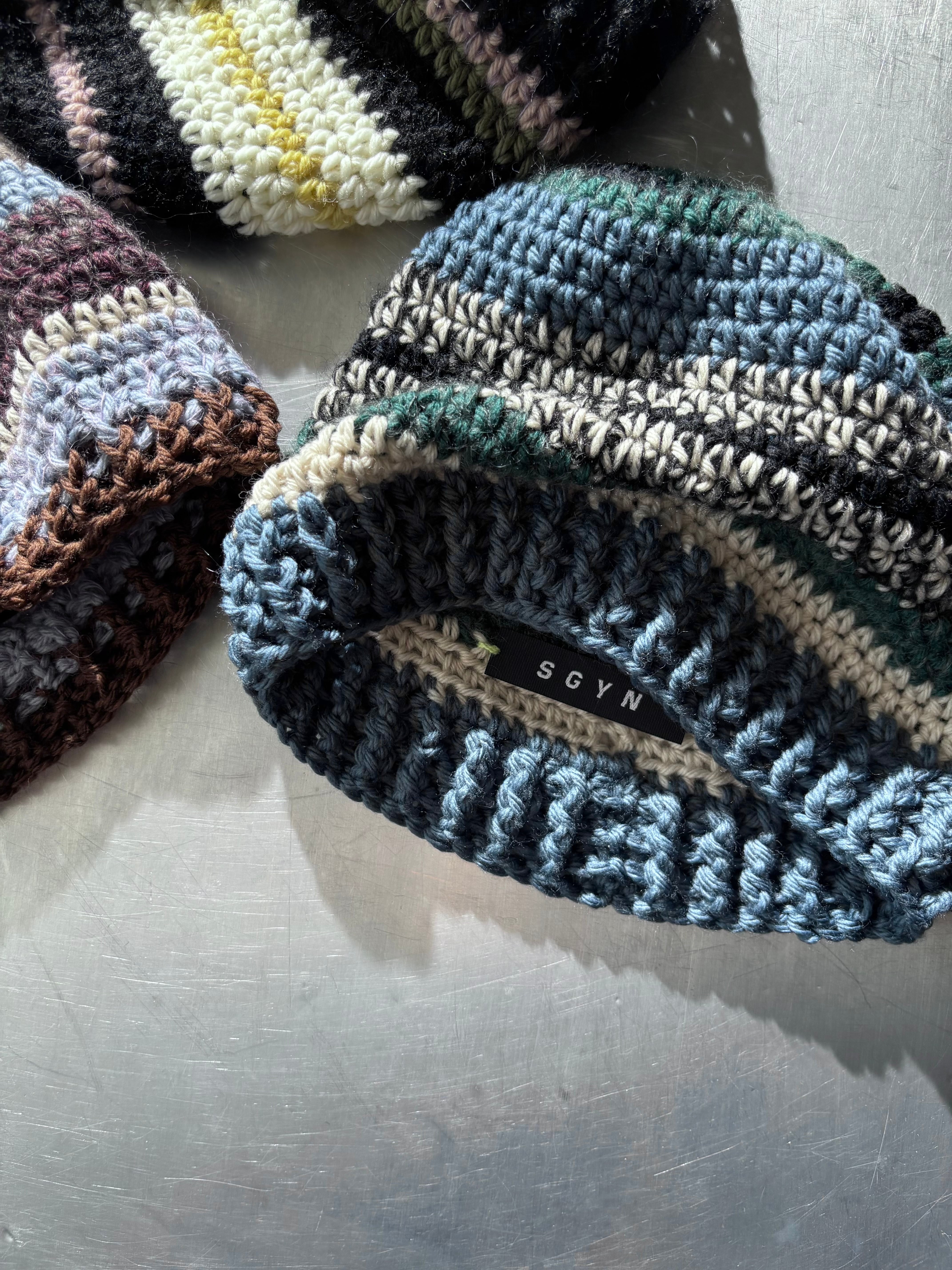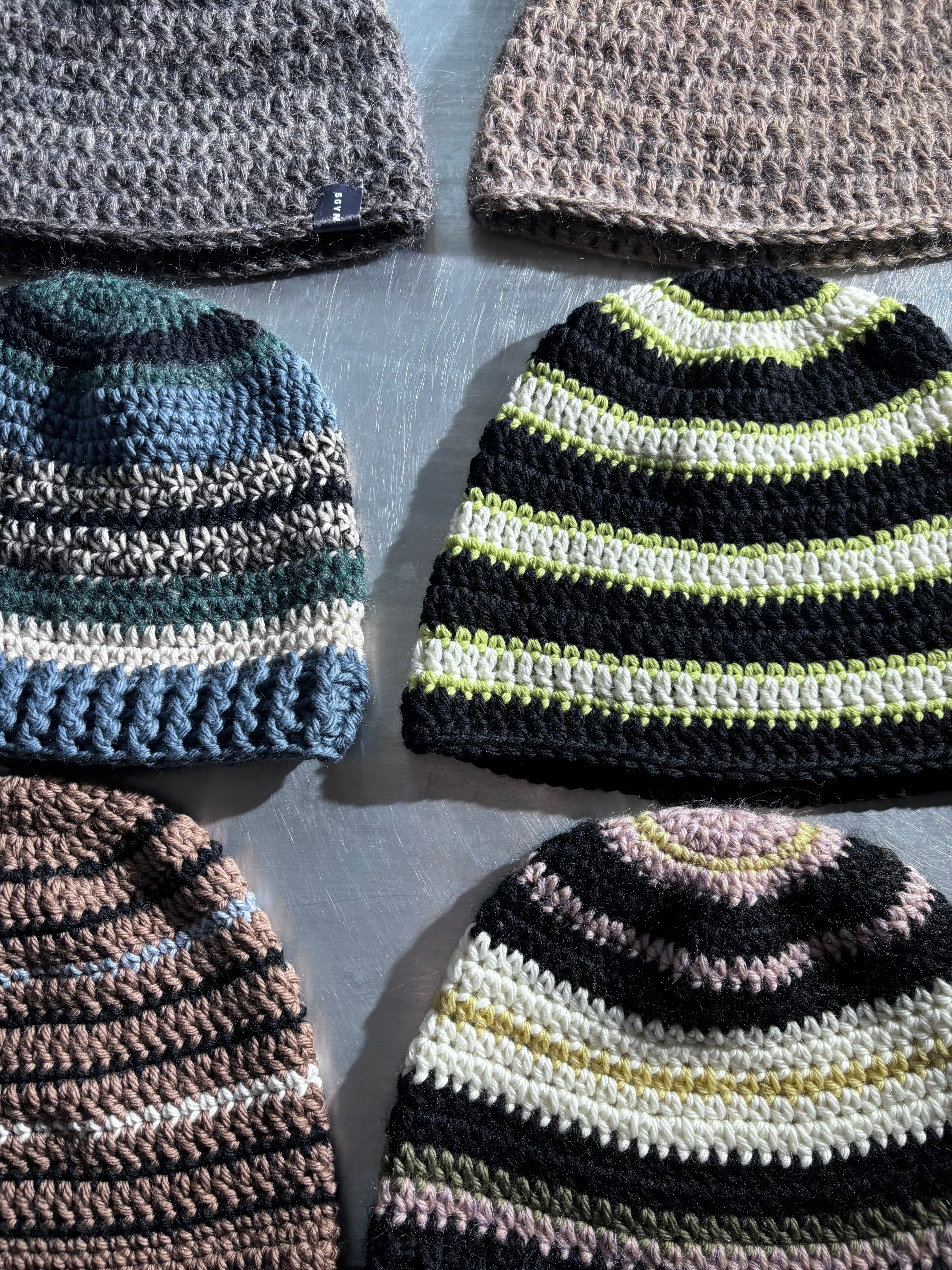 ユニセックスデザインのクロシェ編みのビーニー。メリノウールをベースにモヘアとシルクのブレンド糸を使用した贅沢な素材で編み立てました。