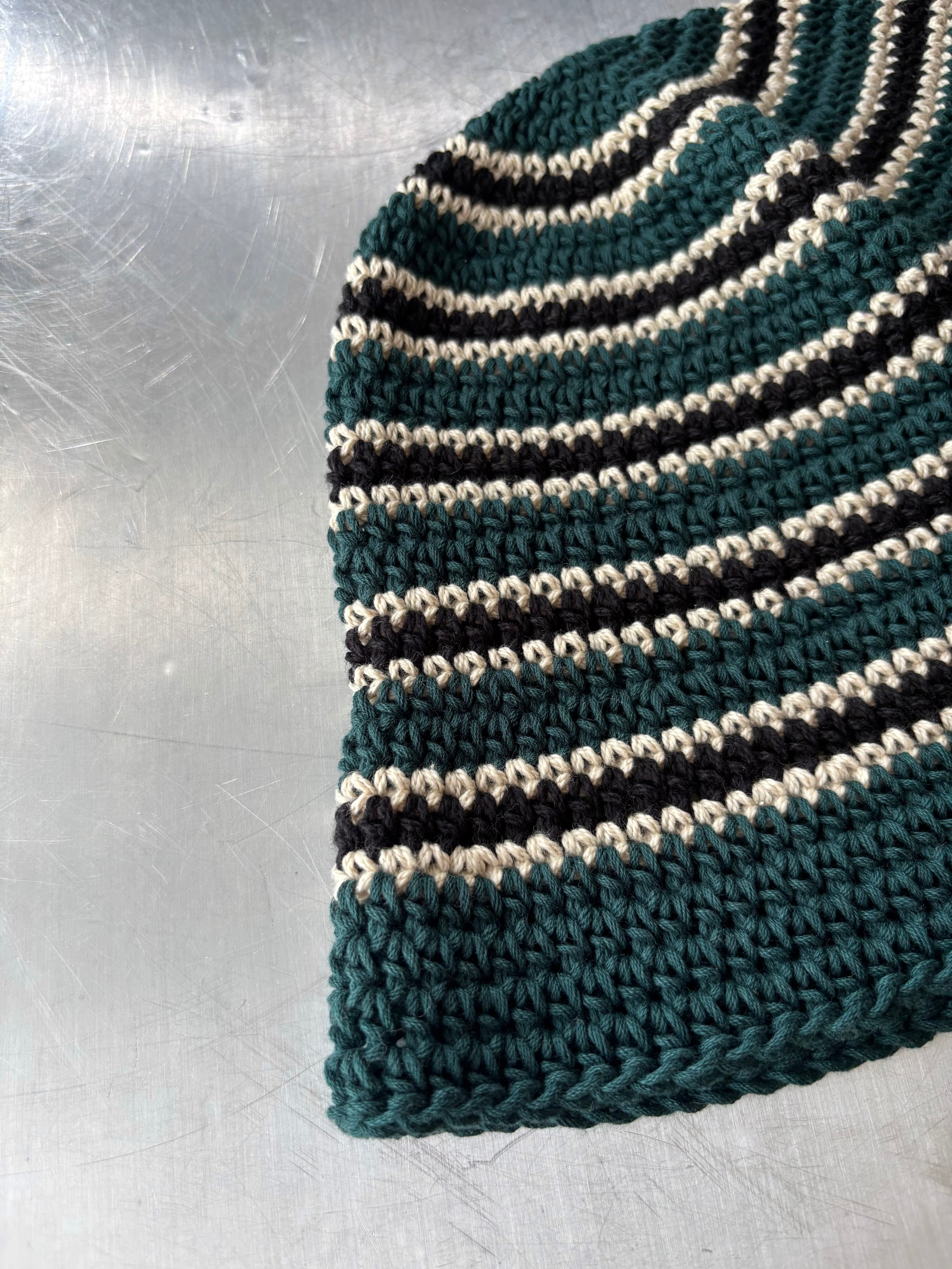 細めのコットン糸で編み立てたクロシェ編みのニットハット。