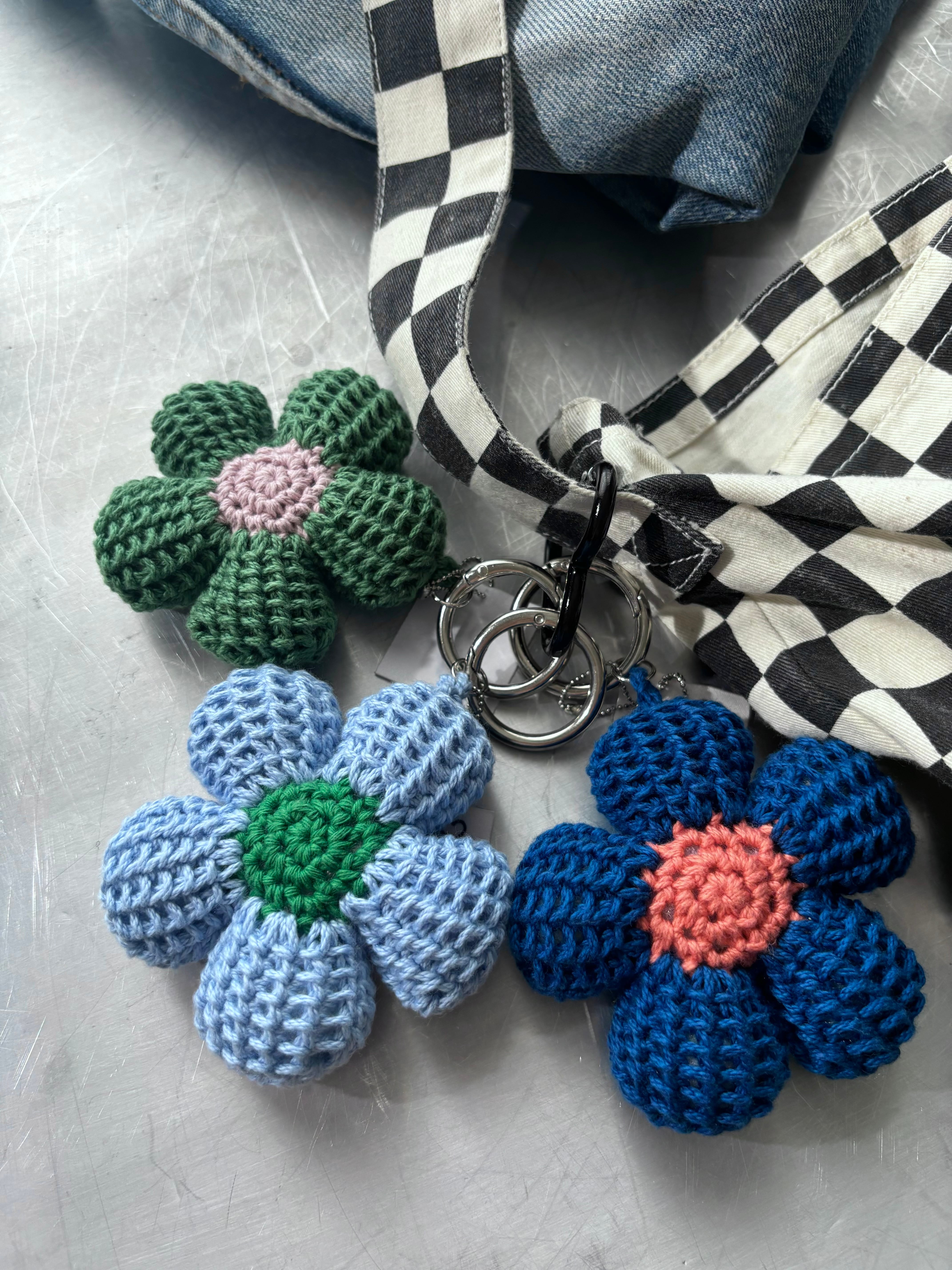 ひとつひとつ手編みしたフラワーモチーフのキーリング。