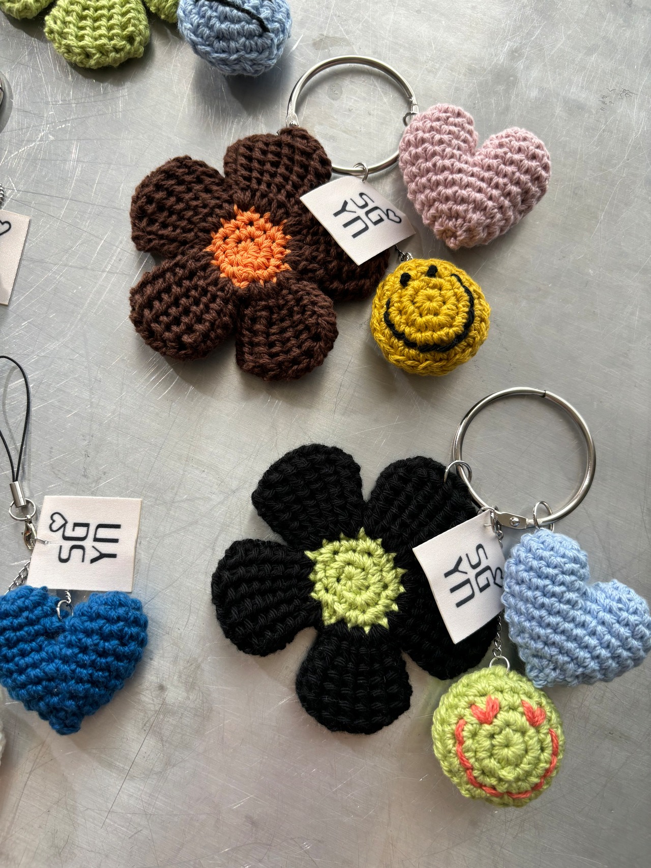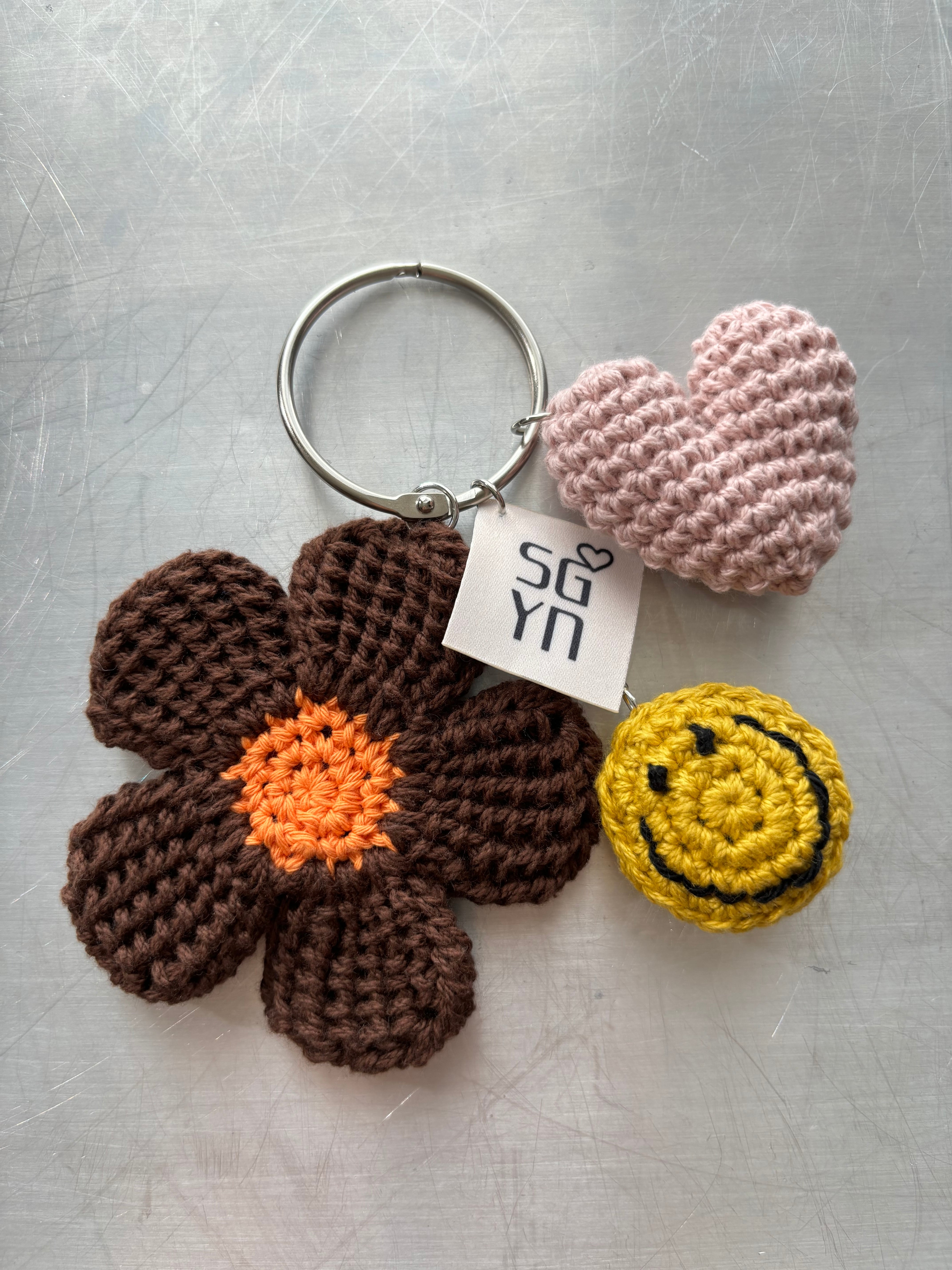 フラワー、フェイス、ハートを組み合わせたスペシャルなキーチェーン。