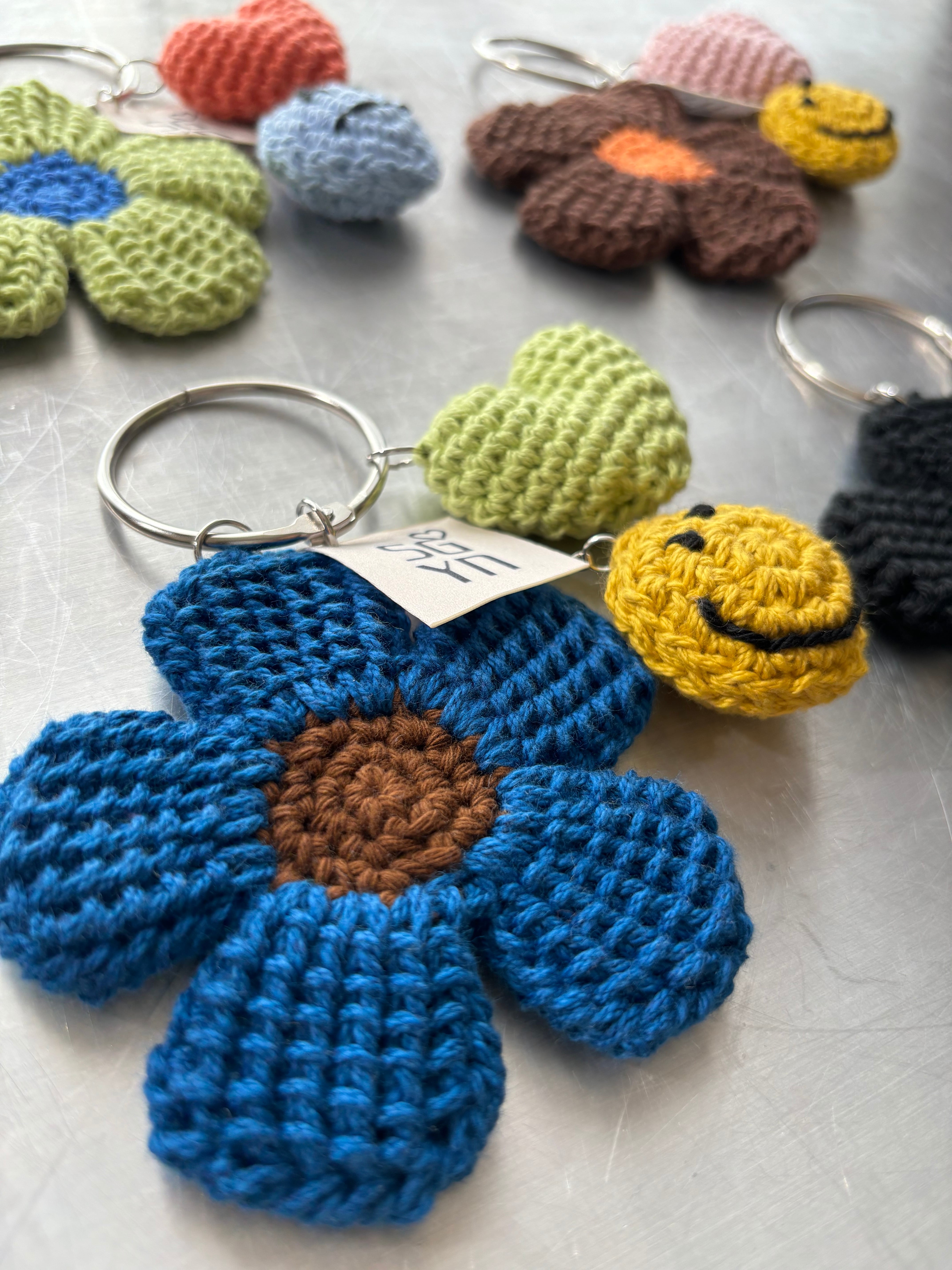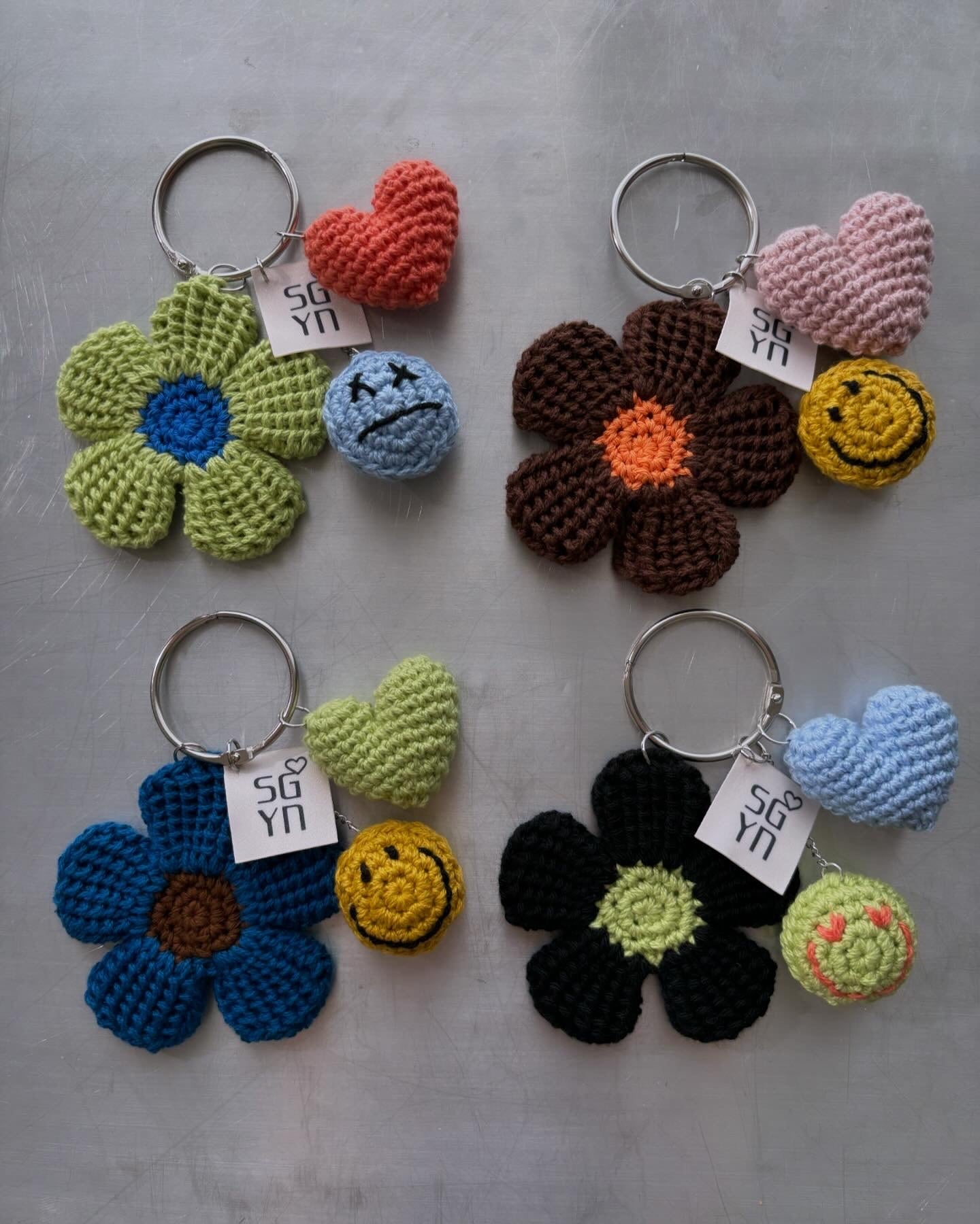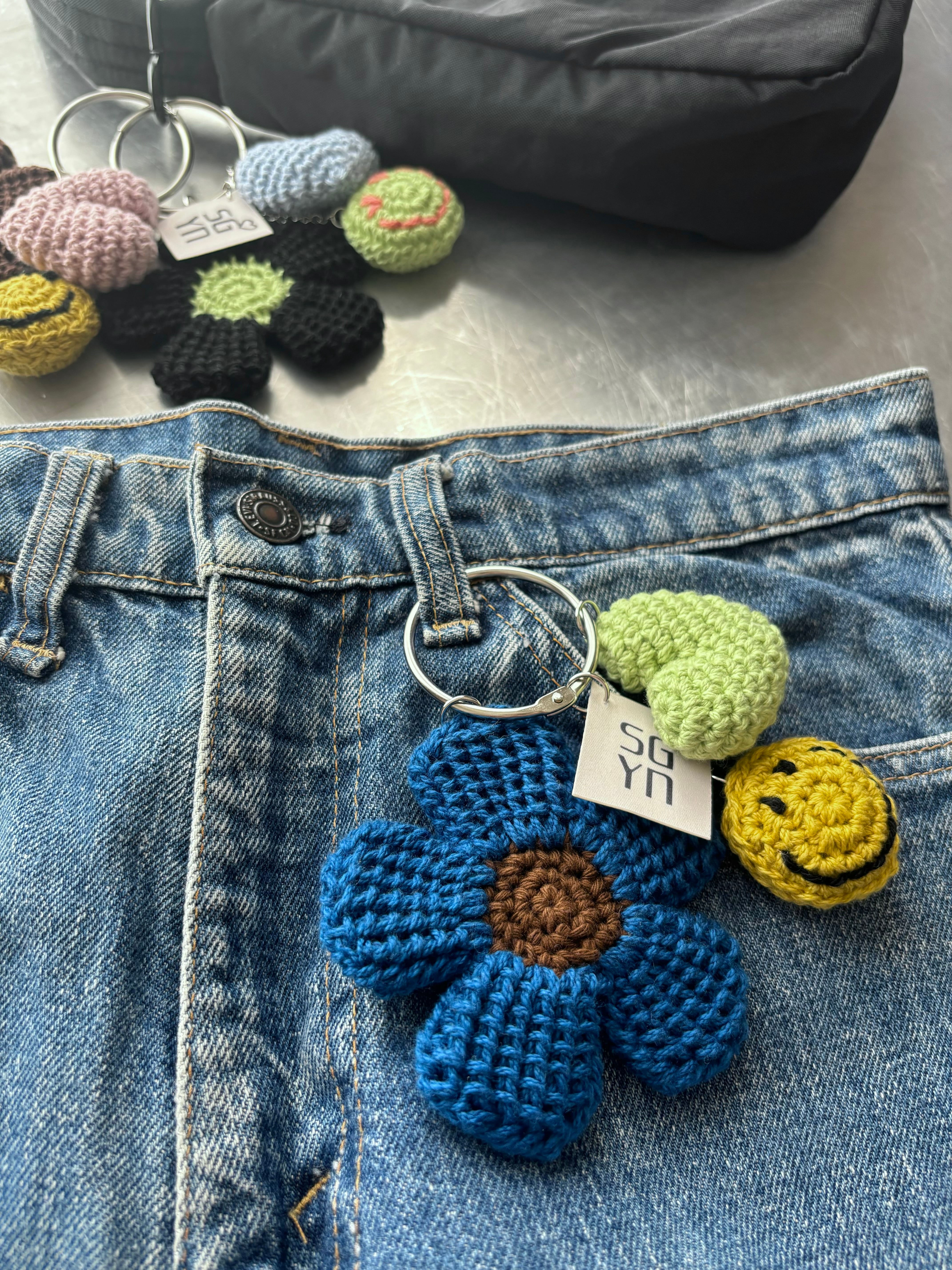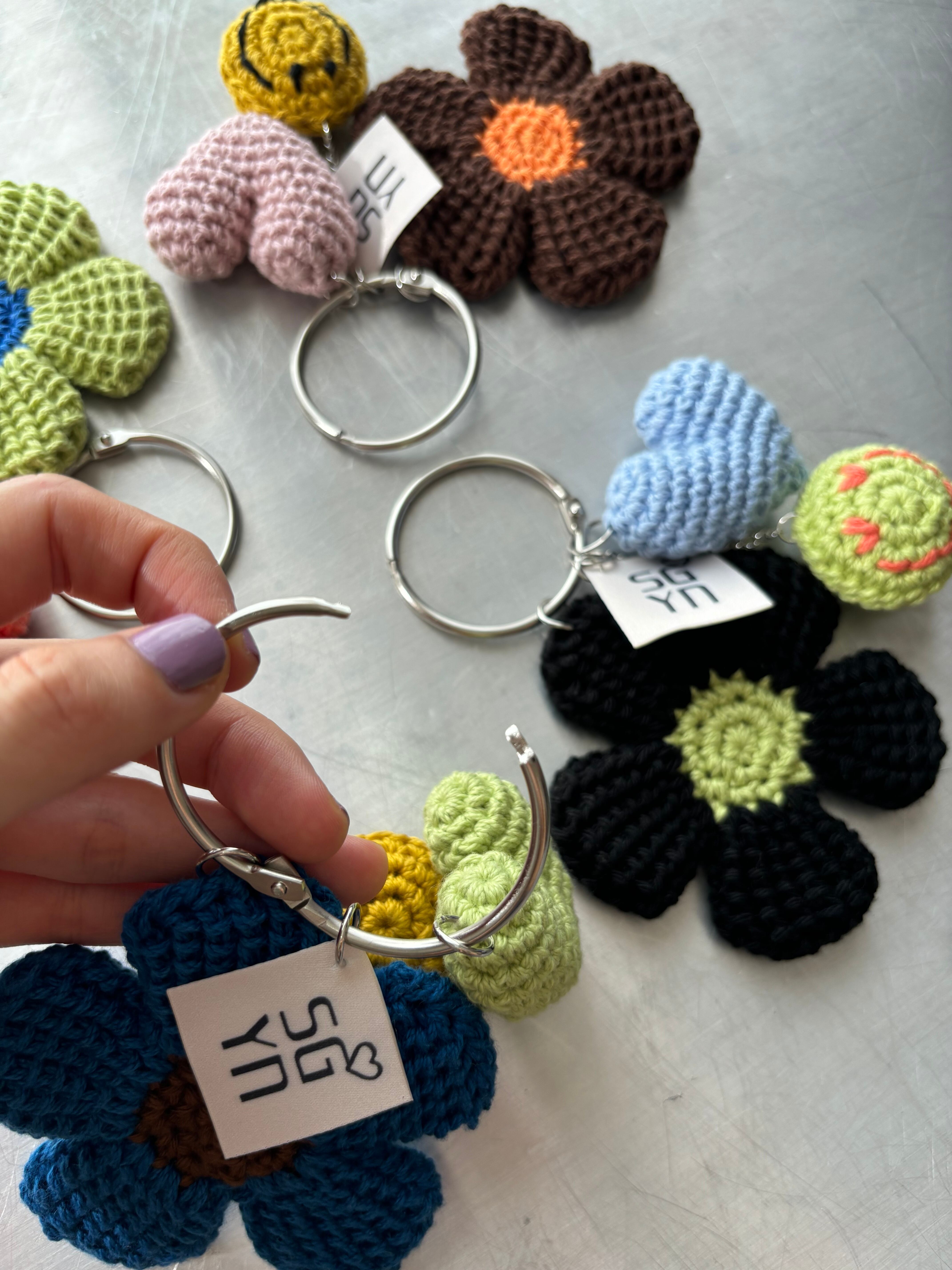 フラワー、フェイス、ハートを組み合わせたスペシャルなキーチェーン。