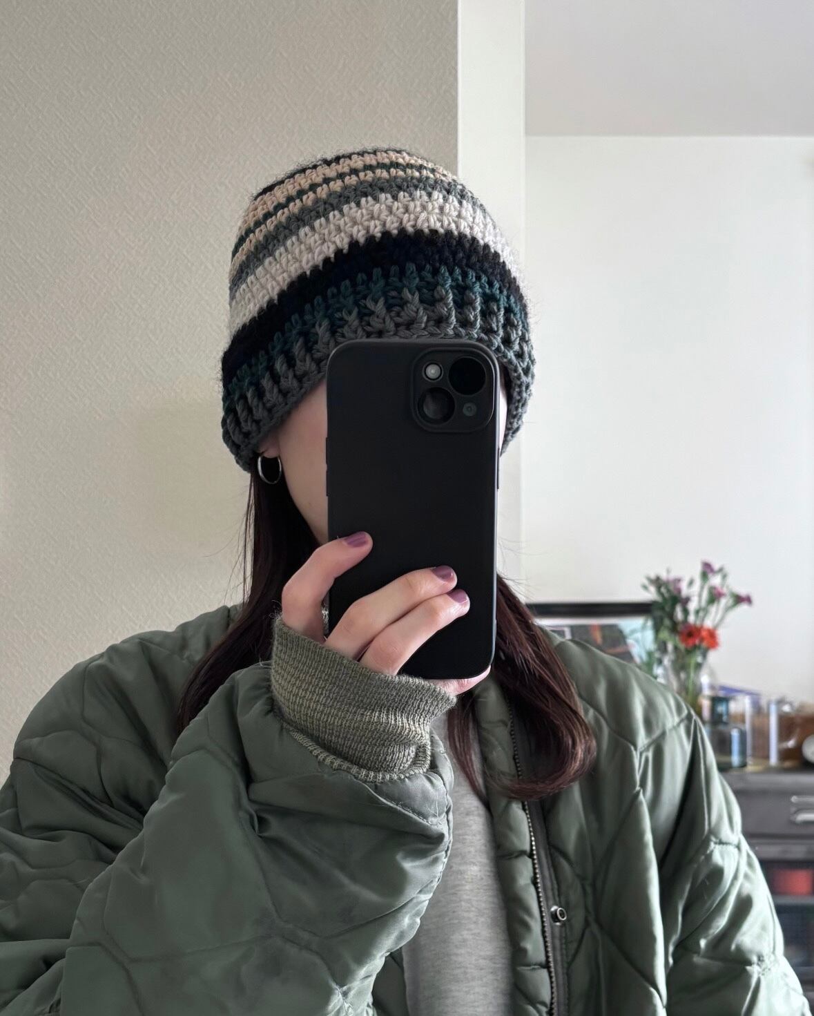 メリノウールをベースに、キッドモヘア×シルクの混紡糸などをmixして編み立てた季節感のあるニットキャップ。